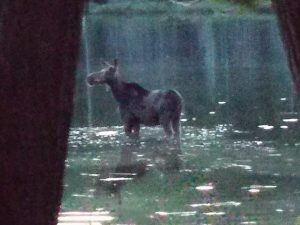 At dusk we got a place called Rainbow Deadwaters. As we walked in silence I heard some very loud splashing in the bog to my right. I knew it was something very big running in the water. However, I could not tell if it was running toward or away from us. I stopped in the middle of the trail and started speaking loudly to the others, in case it was a bear. Then through the woods I saw the shape of a moose. It was a female moose.